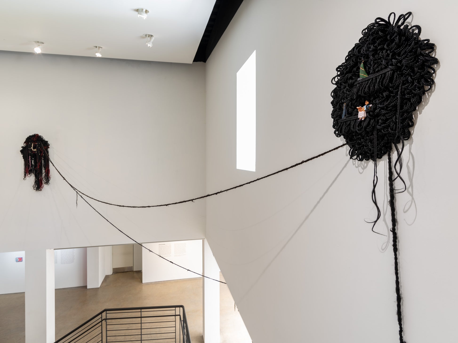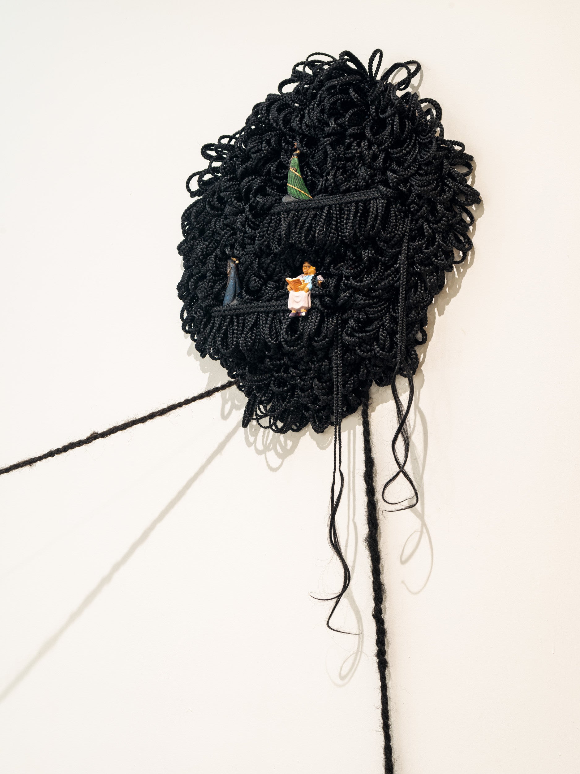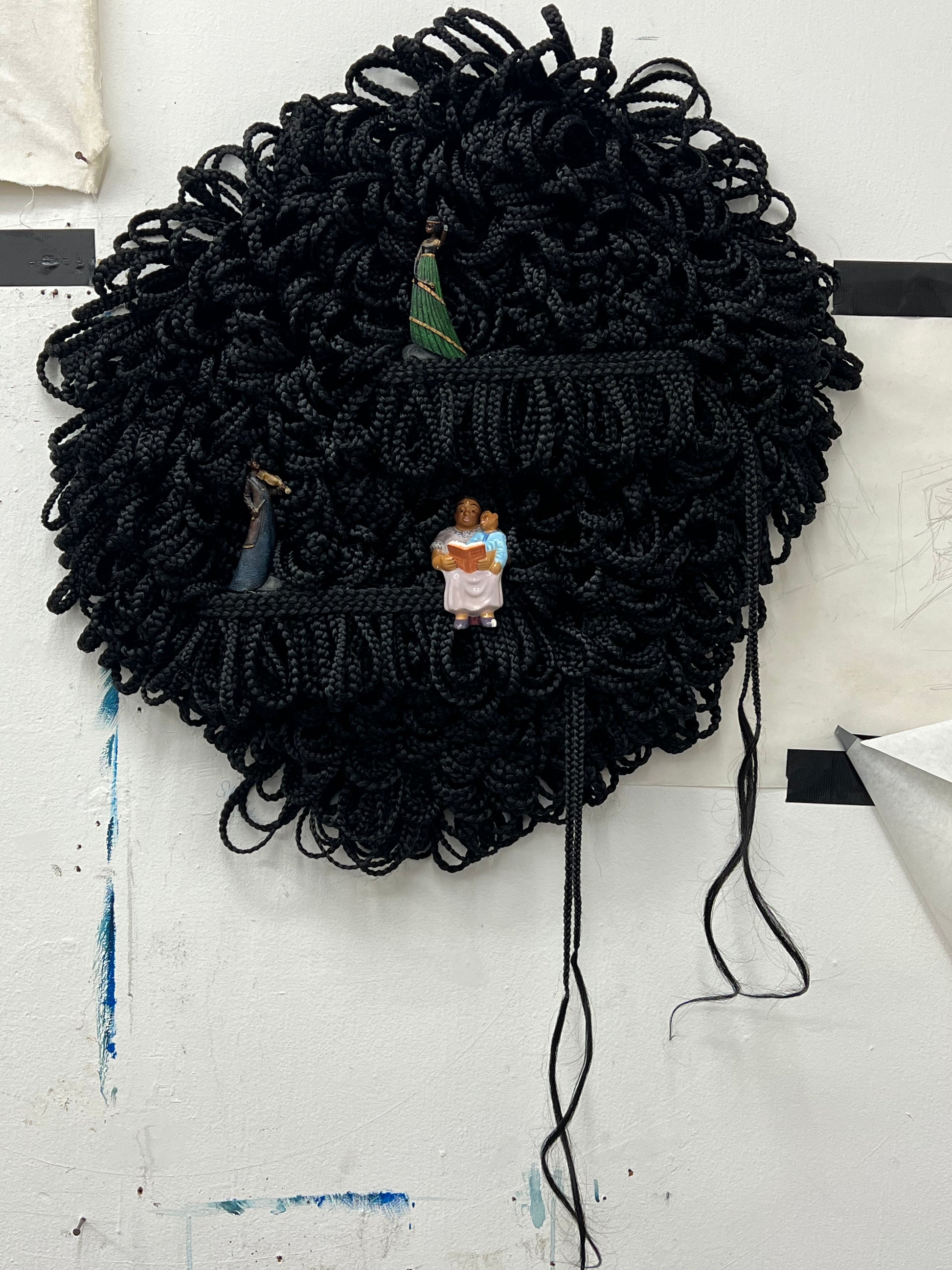 Synthetic braiding hair, ceramic figurines of a young couple, and a grandmother with her grandchild reading him a book